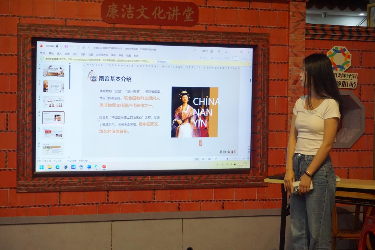 活动期间,队员们还化身“南音小老师”,为社区的小朋友们带来了一堂生动有趣的南音基础知识课。通过通俗易懂的语言和互动游戏,队员们向孩子们介绍了南音的代表性乐器、经典曲目和简单的音乐节奏,引导孩子们感受南音的温婉雅致。课堂上,孩子们好奇地触摸乐器模型,跟着节奏轻声哼唱,纯真的眼神中充满了对传统文化的向往,也让队员们看到了南音传承的希望。