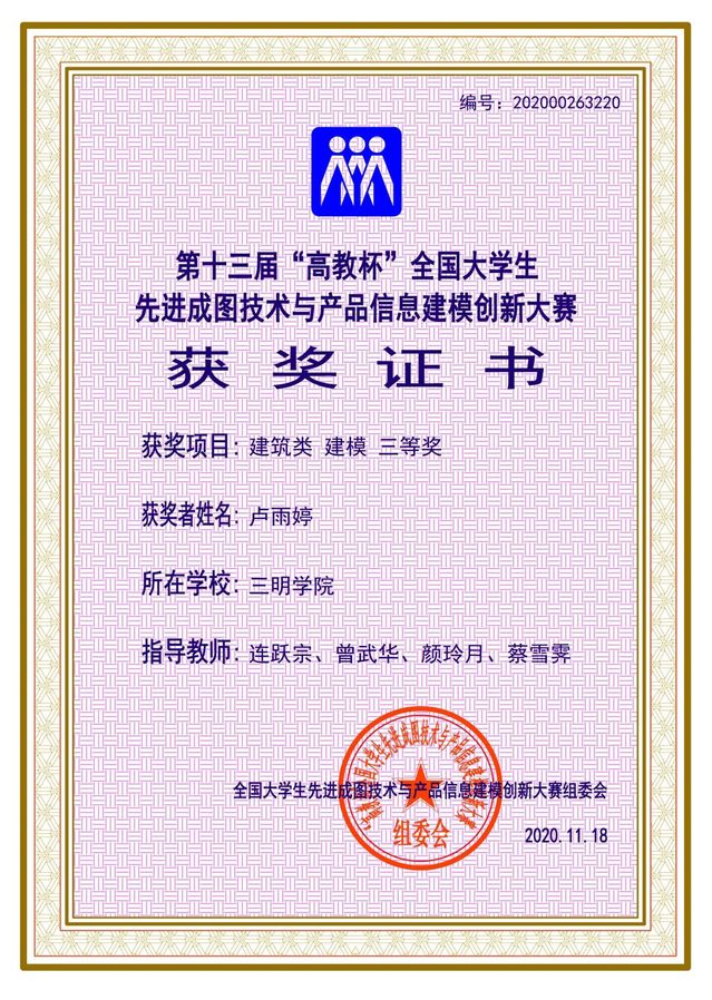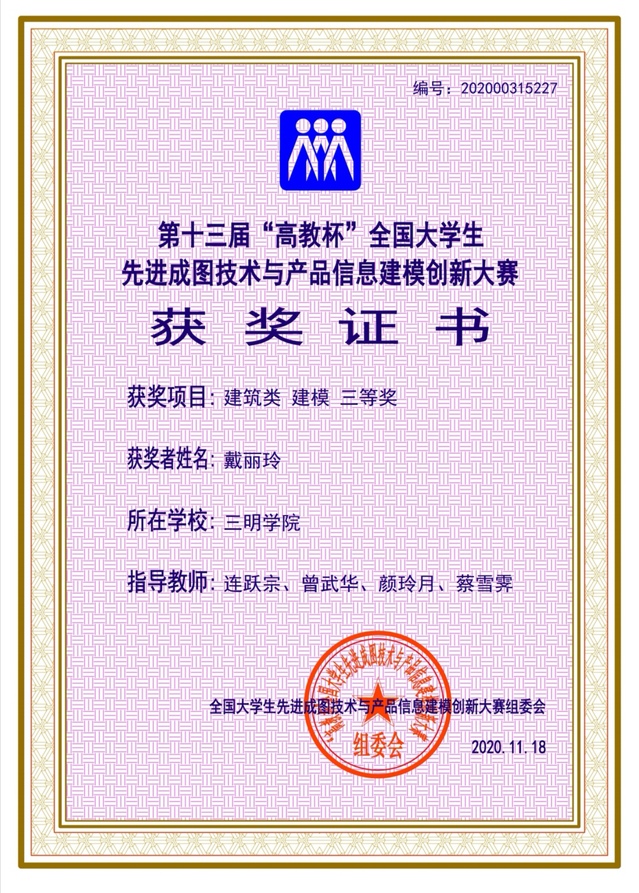 2020年11月13至15日,由全国大学生先进成图技术与产品信息建模创新大赛组委会、中国图学学会制图技术专业委员会、中国图学学会产品信息建模专业委员会和主办南昌航空大学主办,高等教育出版社等协办的第十三届全国大学生先进成图技术与产品信息建模创新大赛顺利落下帷幕,我院代表队获得建筑类建模个人三等奖2项。该赛事列入yl6809永利官网大学生科技创新B类竞赛,也是工程图学课程最高级别的国家级赛事,被誉为“图学界的奥林匹克”。