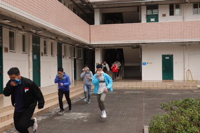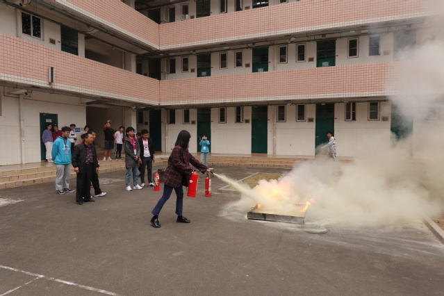 随着烟雾弹的点放及三声哨响,同学们用湿毛巾捂住口鼻,俯身紧张有序地按照既定路线从宿舍楼向篮球场等安全地带迅速撤离。待同学们安全到位后,保卫处吴老师现场向同学们详细讲解了灭火器的使用方法,并现场进行了演示,邀请部分同学上台体验使用灭火器灭火的过程。