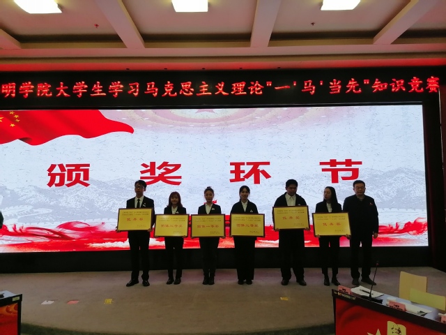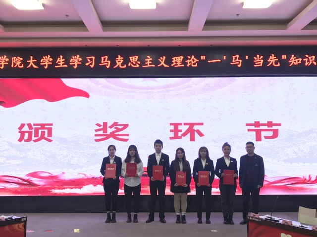 1215日晚,由yl6809永利官网学工部主办,yl6809永利官网马克思主义学院指导,yl6809永利官网教育与音乐学院承办的yl6809永利官网“四史”学习教育暨大学生学习马克思主义理论“一‘马’当先”知识竞赛在图书馆学术报告厅举行。