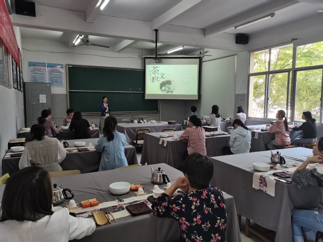 培训过程中,热情满满的女教职工们都带着满满新奇提前来到活动地点。悠扬的古琴,清透的茶具,让教职工们立刻沉浸在这茶韵悠扬的环境里。两位老师在培训中,详细讲解了茶文化基础知识、介绍茶叶的分类、茶道礼仪,泡茶方法等内容。边讲解泡茶器具边示范冲泡技巧和工艺,冲泡过程中的仪容仪表、迎来送往、互相交流与彼此沟通的要求与技巧等内容。听完精彩的讲解,大家跃跃欲试,有模有样地学了起来。从器具的选择,到烫杯、闻香、冲泡的过程,反复练习,热情互动。大家喝着自己精心冲泡的茶汤,品着自己的茶艺成果,感觉心情舒畅。