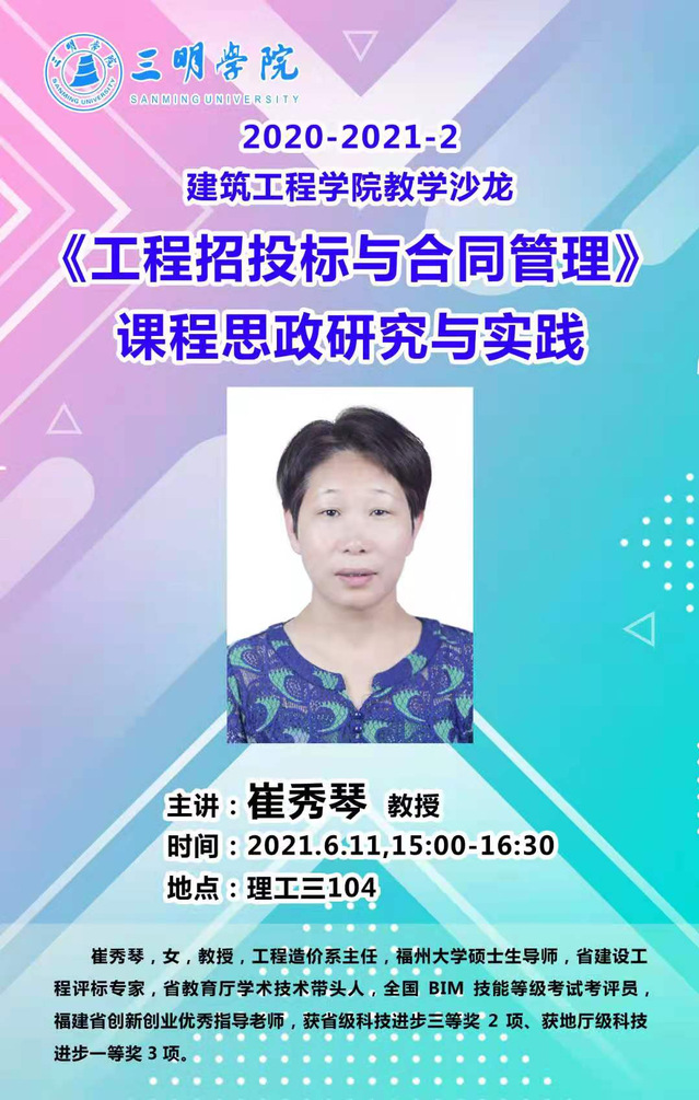 为加强课程思政建设,2021年6月11日,在理工三104,工程造价系主任崔秀琴教授做“《工程招投标与合同管理》课程思政研究与实践”教学沙龙。
