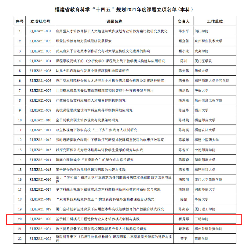 近日福建省教育科学“十四五”规划2021年度课题评审结果公示,我院崔秀琴老师申报的《基于新工科模式工程造价专业人才培养模式创新与实践》项目获批立项,这是我院教师首次获得省教育科学规划课题资助。