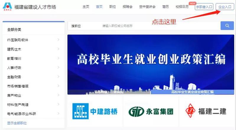 1.注册报名:登陆福建省建设人才市场网(jy.968777.cn)→点击“企业入口”→点击“企业”注册→完善企业信息,等待审核→审核通过→点击导航栏“招聘会列表”→选择“福建省2022年住房城乡建设行业毕业生(人才)专场网络视频招聘会”→点击报名参会,并填写招聘信息→待审核招聘信息→审核通过。