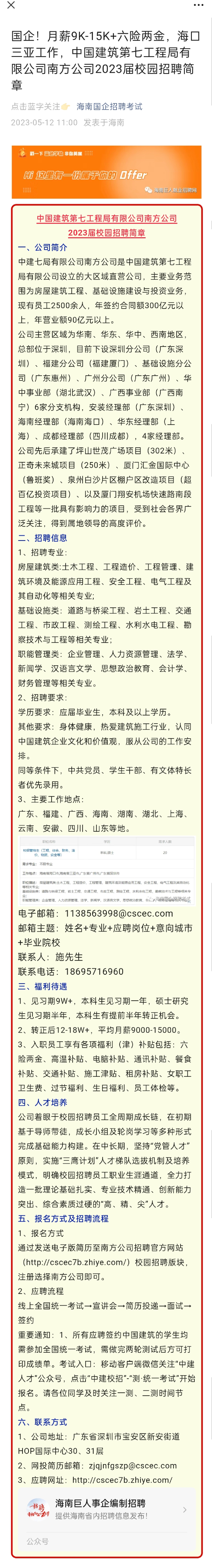 国企!月薪9K-15K+六险两金,海口 三亚工作,中国建筑第七工程局有限公司南方公司2023届校园招聘简章
