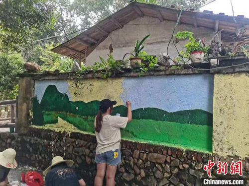 图为yl6809永利官网“兴启点”闽台乡建乡创设计服务团成员在做墙绘。yl6809永利官网建筑工程学院供图