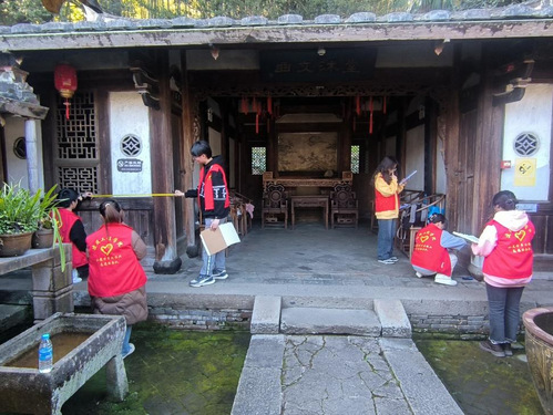 怀着对历史的无比敬畏之情,队员们对萃园书院进行了全面而系统的测绘,他们利用无人机技术从空中捕捉萃园书院整体布局,通过激光测距仪精确测量建筑的尺寸和间距,使用卷尺详细记录建筑关键细节数据,这些宝贵的数据将被转化为手稿和CAD图纸,为后期建立三维数字模型奠定了坚实的基础。实践团队将提取其特色元素运用到乡村景观营造中,他们希望通过这种方式,将萃园书院的历史文化魅力广泛传播,为乡村振兴和文化传承贡献自己的力量。