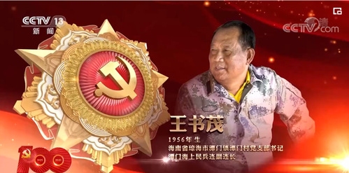 王书茂,男,汉族,1956年12月生,1996年6月入党,海南琼海人,海南省琼海市潭门镇潭门村党支部书记、村委会主任,潭门海上民兵连副连长,第十三届全国人大代表。为国护海的模范,先后参加多项国家重大涉海工作,参与南沙岛礁建设,培养南海维权民间力量。在南海维权斗争中冲锋在前,不怕牺牲、寸步不让,坚决捍卫我国领海主权和海洋权益。带领群众造大船、闯深海,发展休闲渔业、建起海洋民宿,实现共同致富。荣获“全国劳动模范”、“改革先锋”等称号。