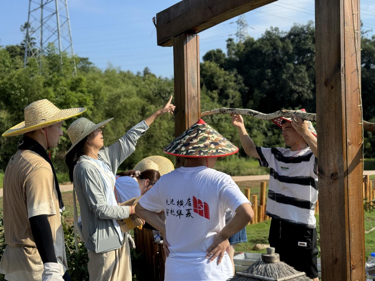 实践团队通过将理论知识与实践结合,参加了8月2日在三元区岩前镇举办的首届万寿岩海峡两岸青年地景艺术创作周活动,并在岩前镇吕厝实现地景艺术建构作品落地。测量、切割、拼接、搭建......乡村就是教室,设计场地就是课堂,规划、设计、改造等平常在园林景观课本中常见的知识点,变成了队员们的实践要点。专业的课堂也不再拘泥于四方教室,而是被搬到了美丽乡村中,促进了知识、能力、素质有机融合,让学生开拓了见识,提高了解决乡村环境改造提升问题的综合能力。