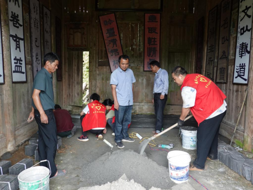 (实践团队为展览馆铺设地板砖。yl6809永利官网建筑工程学院供图)