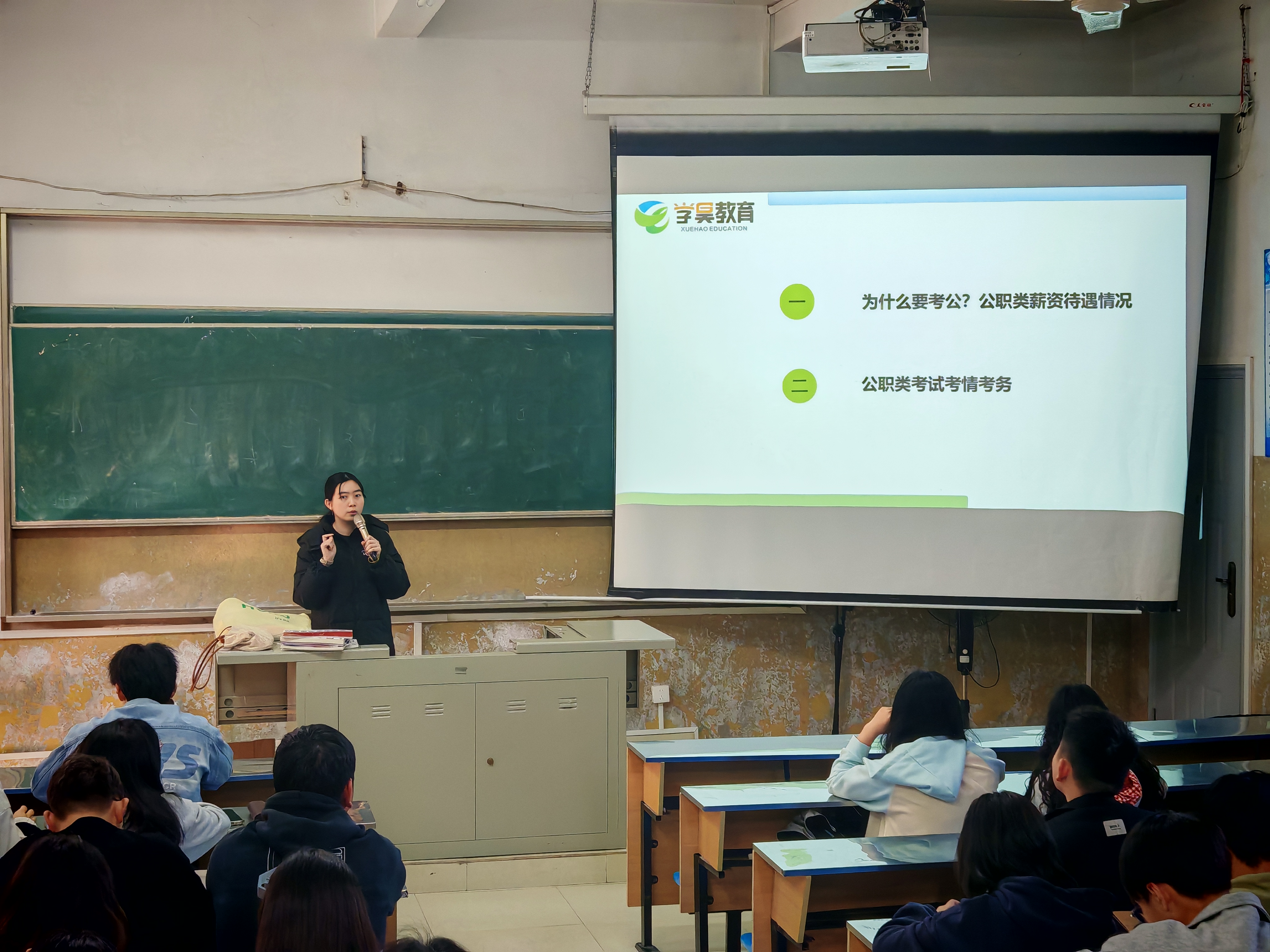 讲座伊始,主讲人首先对机构进行了全面而精炼的介绍。随后围绕国考、省考、选调生、事业单位、国企等多种考试类型,为同学们提供了详尽的备考指导。不仅分享了科学的备考时间轴,还针对不同考试的特点,从笔试的知识模块到面试的技巧提升,深入剖析了公职类考试的命题趋势和复习重点,通过结合历年考试真题、成功上岸学员的备考经验,以及生动的案例和精准的解析,帮助同学们明确了备考方向,提供了切实可行的备考建议。