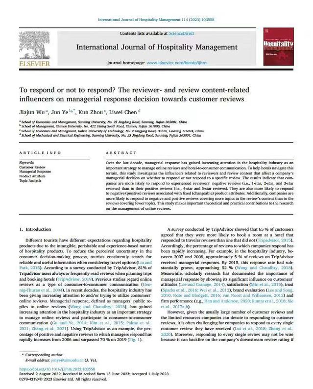 近日,yl6809永利官网经济与管理学院伍家军博士为第一作者,yl6809永利官网为第一单位,在旅游管理学科国际顶尖期刊《International Journal of Hospitality Management》上发表了题为《To respond or not to respond? The reviewer- and review content-related influencers on managerial response decision towards customer reviews》的学术论文。论文研究了作为酒店管理在线评论和与消费者沟通的重要策略,为在线评论管理的理论研究和企业实践提供了借鉴和参考。