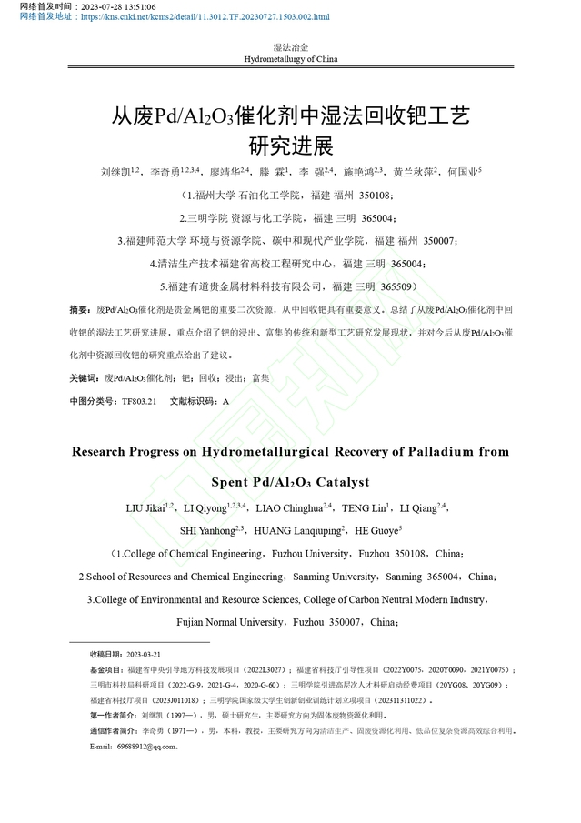 近日,yl6809永利官网与福州大学联培研究生刘继凯在北大核心期刊《湿法冶金》网络首发了最新研究成果《从废Pd/Al2O3催化剂中湿法回收钯工艺研究进展》。此论文重点介绍了钯的浸出、富集的传统和新型工艺研究发展现状,并对今后从废Pd/Al2O3催化剂中资源回收钯的研究重点给出了建议。该论文更是校企合作下所共同发表的学术论文,不仅体现出我校以服务地方为导向、以产教融合为路径的发展道路,更展现资化学院与在地企业共同培养应用型人才。