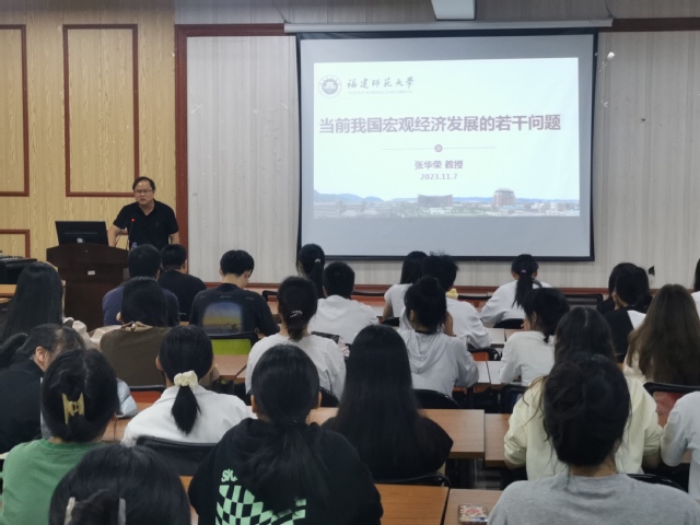 2023年11月7日下午,福建师范大学经济学院教授,博士生导师,福建师范大学协和学院院长张华荣教授受邀在厚德楼304教室为我院师生作题为《当前我国宏观经济发展的若干问题》的学术讲座。100余位学生聆听了报告。讲座由经济与管理学院副院长张桂梅教授主持。