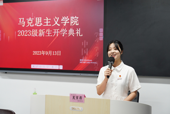 2023级思想政治教育专业周诗语作为新生代表发言,她以《感恩故事的力量》为题,表示在今后的学习生活中,将学习并应用专业知识中所蕴含的信仰、理论与教育的力量,对标优秀校友为榜样,用青春和汗水,去实现美好的人生理想。