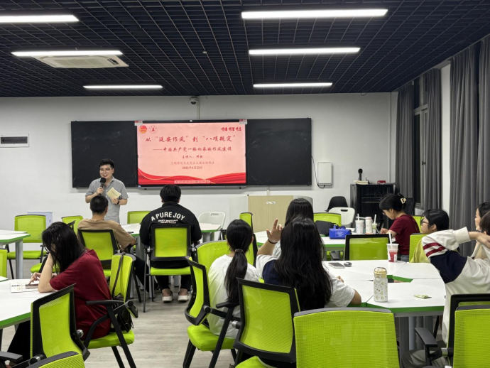 为深入学习习近平总书记关于加强党的作风建设的重要论述,推动深入贯彻中央八项规定精神学习教育走深走实,2025年4月23日,马克思主义理论读书社于明德楼(二)智慧教室组织《从“延安作风”到中央八项规定——中国共产党一脉相承的作风建设》讲座,此次讲座由马克思主义学院邓然老师主讲。