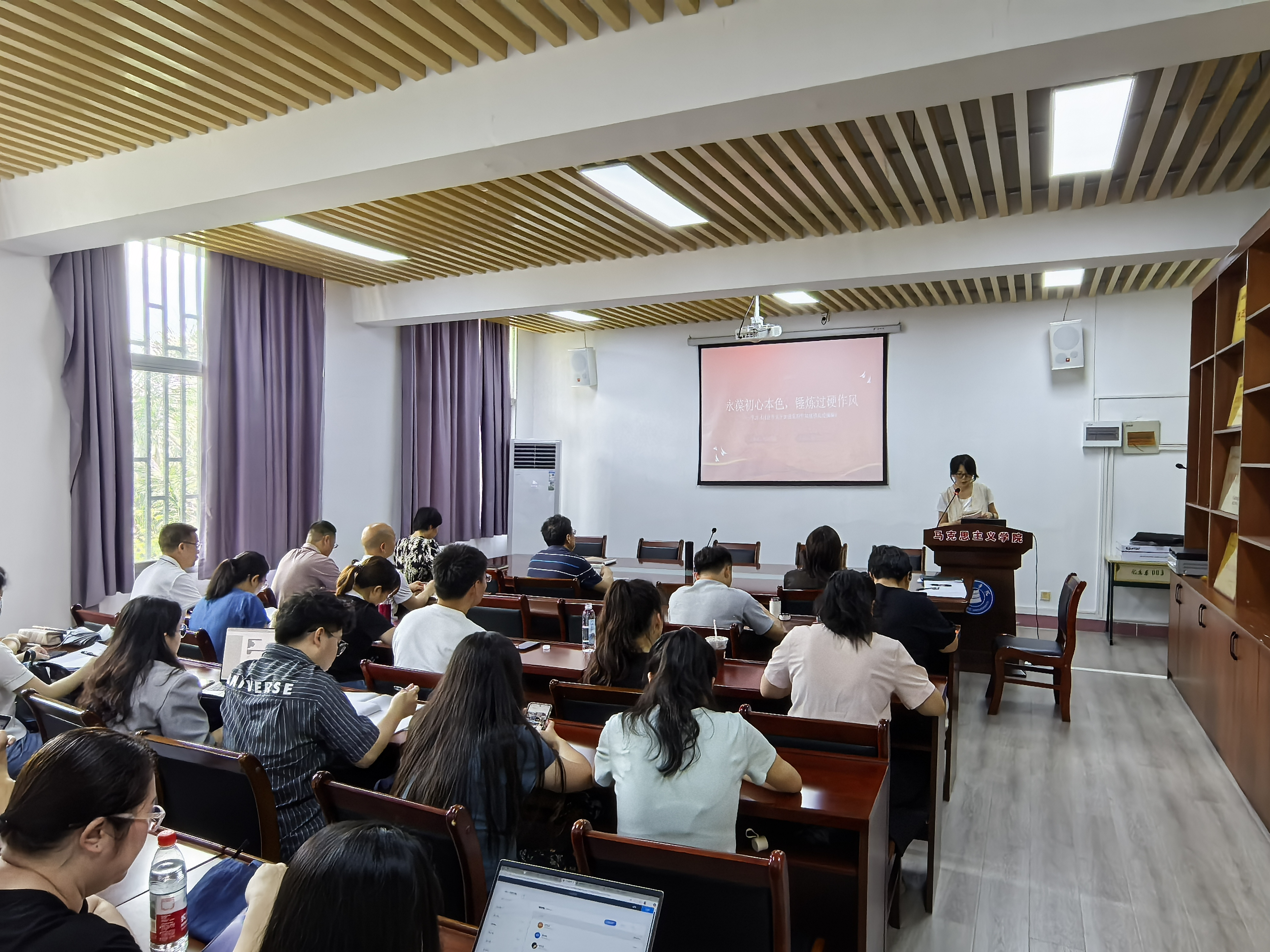 欧阳秀敏副院长从党的作风的科学内涵、推进作风建设的历史必然性和新时代推进作风建设的实践路径等三个方面开展题为“永葆初心本色,锤炼过硬作风”的专题党课。她指出,作风建设永远在路上,全面从严治党永远在路上。全体党员要以习近平总书记关于作风建设的重要论述为指引,从百年党史中汲取智慧力量,以“功成不必在我”的精神境界和“功成必定有我”的历史担当,为培养担当民族复兴大任的时代新人、为马克思主义学院高质量发展提供坚强作风保障。