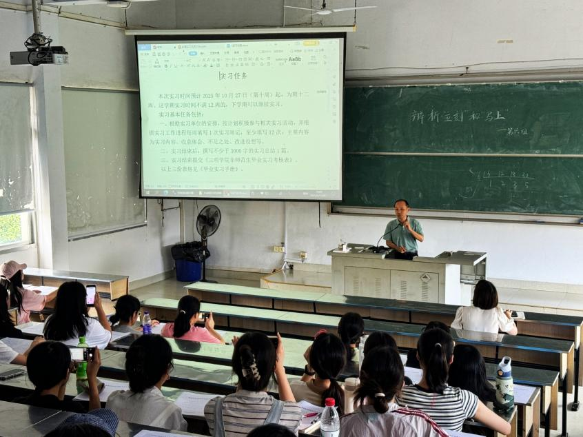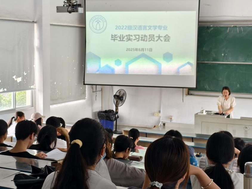 6月11日下午,文化传播学院在鸿文楼(一)301教室隆重召开了2022级汉语言文学专业毕业实习动员大会。本次会议由中文系主任陈桐主持,出席动员会的包括院党委范桂英副书记、辅导员肖雄老师以及2022级汉语言文学专业的全体58名实习生。