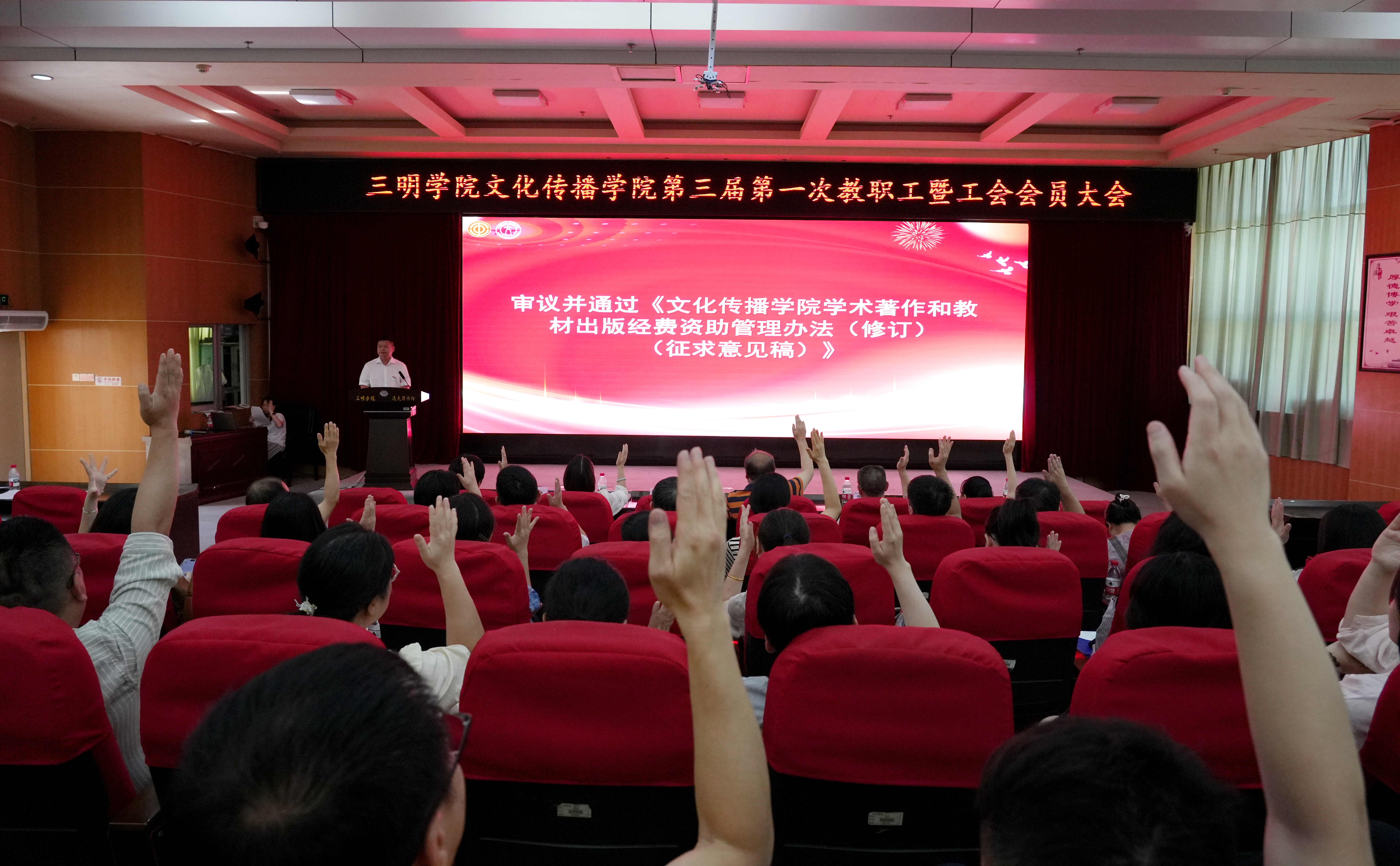大会在庄严的国歌声中拉开帷幕。会议听取并审议了院长赵平喜作的《文化传播学院工作报告》,赵平喜院长从党建引领、师资队伍、学科专业、教学科研、学生发展等方面回顾工作,分析学院当前发展面临的机遇与挑战,明确未来发展方向和今后重点工作;同时,会议还听取并审议了《文化传播学院学术著作和教材出版经费资助管理办法(修订)》,保障了教职工对学院重要工作的知情权与监督权。