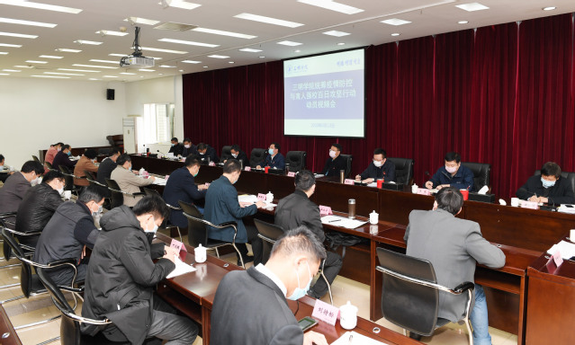 3月13日,我校召开“统筹疫情防控与育人强校百日攻坚行动”动员部署视频会。全体校领导出席会议。