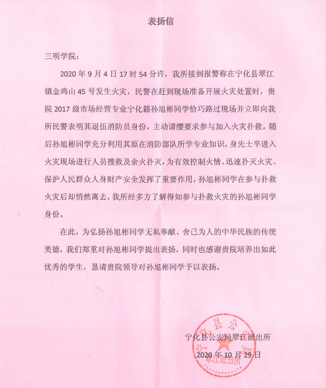 孙旭彬是海峡理工学院2017级市场营销班的一名同学,此外,他也是一名退伍返校大学生。9月4日,孙旭彬外出锻炼身体回家途中,遇到一处民房突发火灾,火势迅速蔓延,吞噬着房屋。出于一名消防员的本能,他主动冲锋上前,利用在部队所学专业知识,进入火灾现场开展人员搜救和灭火行动,为有效控制火情、保护人民群众生命财产安全发挥了重要作用。而在火灾扑灭后,孙旭彬同学却悄然离去。经过派出所民警多方了解,方才得知孙旭彬的身份。
