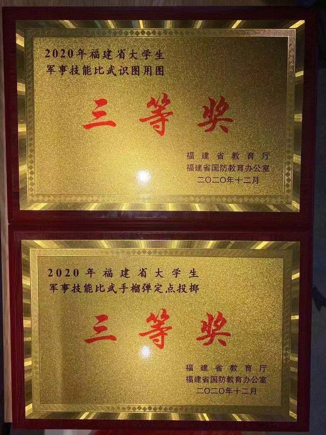 12月25日至27日,2020年福建省大学生军事技能比武活动在福建医科大学旗山校区举行。经过激烈角逐,我校代表队取得了识图用图、手榴弹定点投掷2个课目的三等奖。在参赛的47所福建省高校中排名第十五,位列福建省九地市新建本科高校第一。