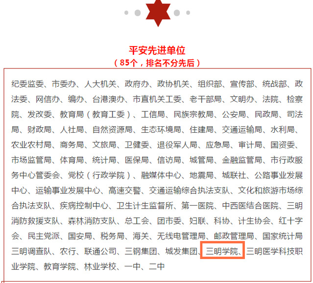 “三明市平安先进单位”荣誉称号的获得,离不开全校各职能部门的通力配合,既是对我校维护社会安全稳定工作的肯定,也是对我校相关工作的鞭策。2021年,学校将坚定坚持以习近平新时代中国特色社会主义思想统揽综治、维稳、安全工作,坚持和谐发展、安全发展理念,牢固树立“安全稳定是一切工作的底线”意识,在总结经验的基础上积极探索校园总体安全工作体系,着力落实“平安校园”创建工作,使学校真正成为广大师生成长的平台、起飞的平台、幸福的平台;将一如既往地做好校园安全稳定工作,为实现学校“工作高质量、岗位创一流”目标及各项事业发展打造更高水平的平安校园环境。
