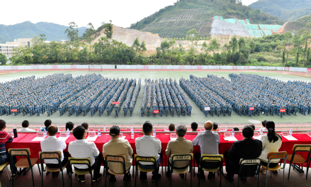 教官们向全体学员做军训科目动作示范。他们整齐划一的列队动作、震耳欲聋的训练口号,赢得了在场师生的阵阵掌声。