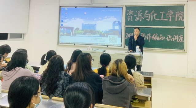 为加强学生安全教育,提高学生的安全意识和防范网络骗能力,保障学生的生命财产安全, 10月21日晚,资源与化工学院在博学楼206举办2021级新生防诈骗安全教育专题宣讲,校防诈骗宣教队成员主讲,校保卫处范钦龙处长、荆东派出所李荣生所长、吴庆文副所长、潘明强警官等到场指导,学院辅导员及2021级全体新生参加。
