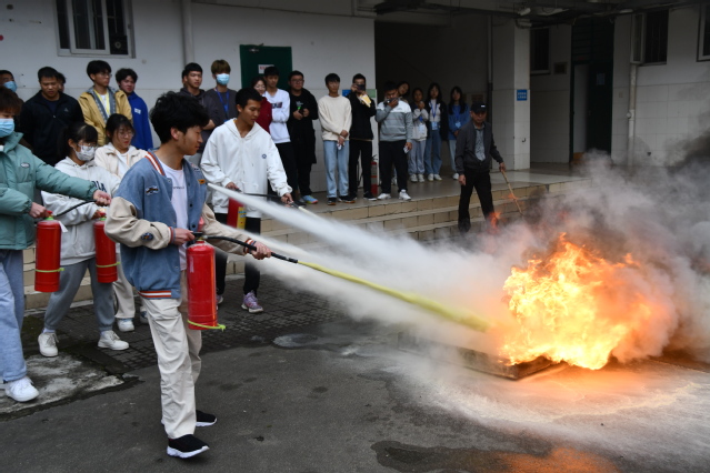 “火灾”来了,“浓烟滚滚”,随着第一声“警报哨声”响起,消防疏散演练开始了。学生按照疏散路线,用湿毛巾捂住口鼻、弯腰俯身,快速、有秩序地逃离宿舍楼,紧急集合在宿舍楼前并迅速确认人员安全情况。现场秩序有条不紊,充分展示了学生在应对火灾时沉着冷静、积极应对的良好风貌,有效地提高了火灾应急逃生能力。随后,进行灭火演练,根据现场工作人员教学讲解,同学们按照“提、拔、握、瞄、喷”的步骤顺利将火扑灭,掌握了灭火技能。最后,校保卫处消防科对此次活动进行点评并提醒同学们要提高宿舍安全意识,做到人走电断,杜绝使用违章电器。同学们纷纷表示,通过切身体验逃生、灭火环节,切实感受到消防安全的重要性,增强了责任感和担当意识。