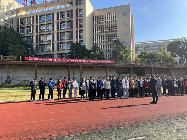 11月29日下午,yl6809永利官网校外人员入校突发暴力事件应急演练在北区田径场顺利开展。宣传部、学生处、保卫处、后勤处等部门相关人员,值班辅导员、荆东派出所、丹田物业、安全保障中心、退役士兵学生应急大队和兵社协会参加活动。