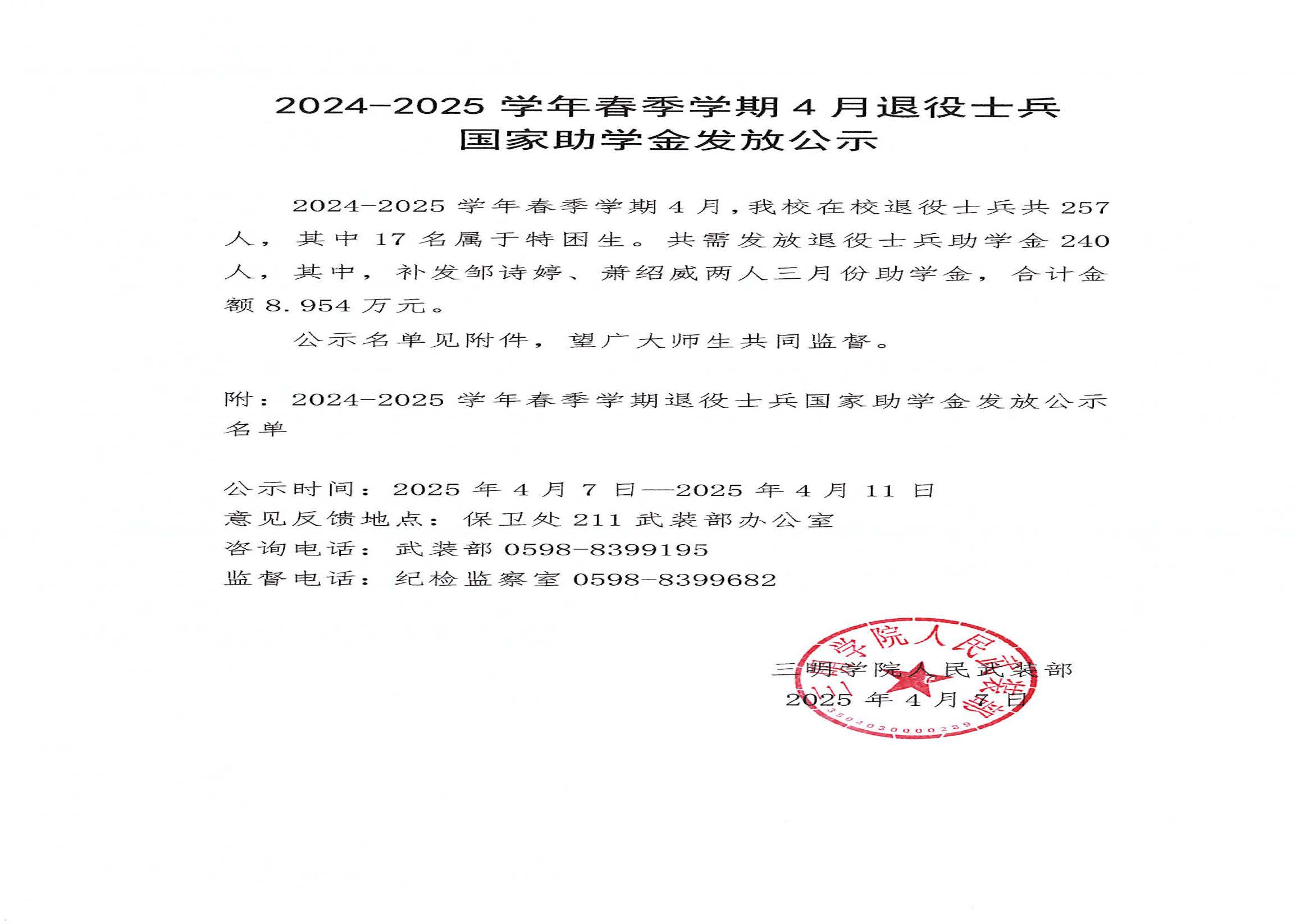 yl6809永利官网2024-2025学年春季学期4月退役士兵国家助学金公示名单