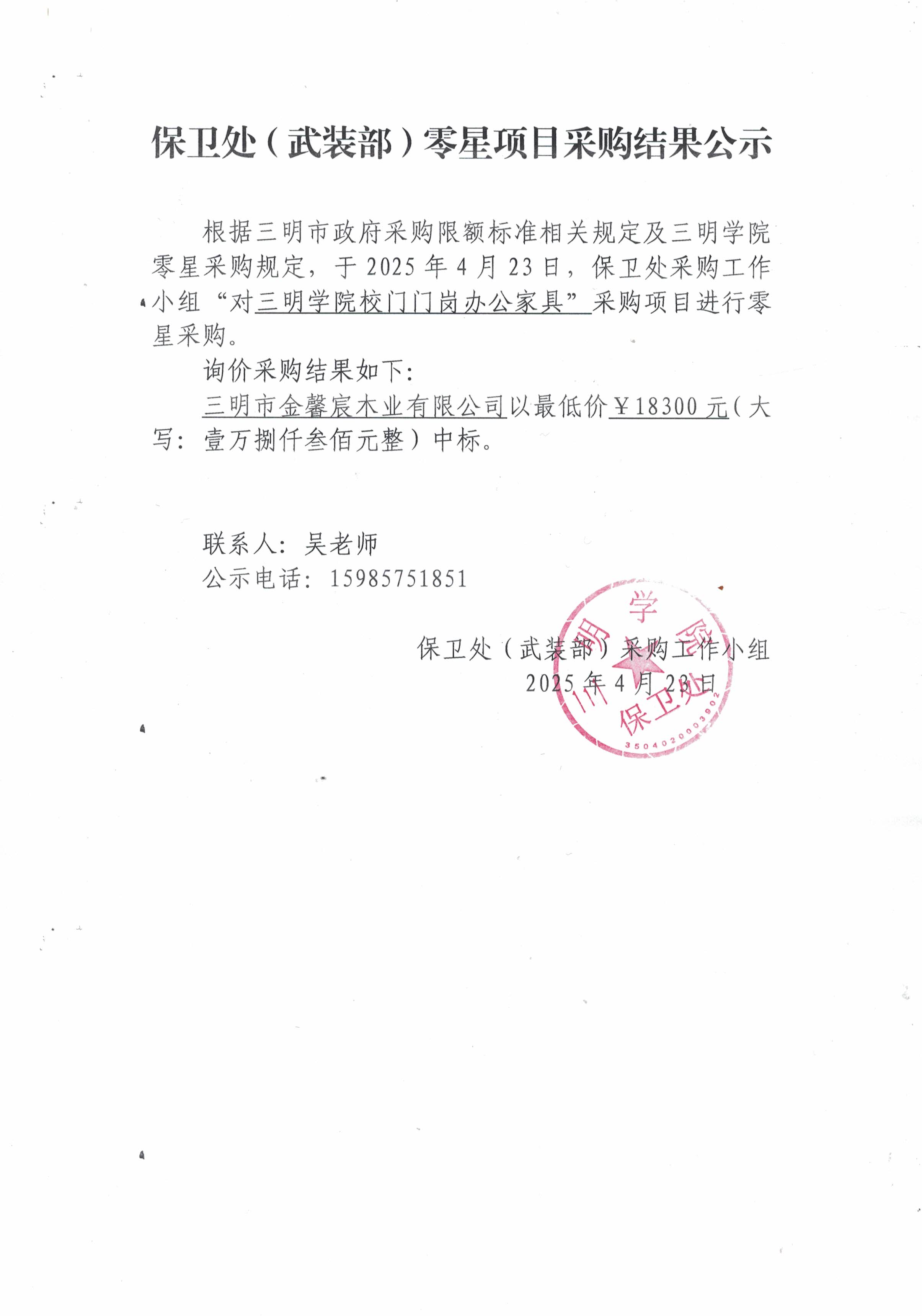 关于2025年4月yl6809永利官网校门岗办公家具采购结果的公示
