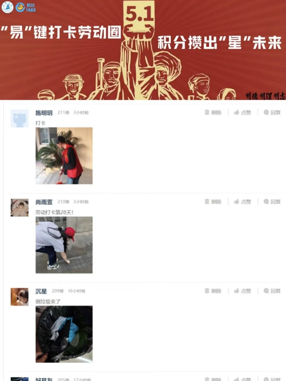 在易班轻应用快搭发起的“30天劳动积分打卡”活动中,学生处以“劳动积分打卡”活动为抓手,构建“日打卡+周积分”激励机制,吸引了176人次积极参与话题讨论并分享日常劳动内容。明院学子们通过清扫校园、农耕实践、社区服务等多样化劳动场景打卡,形成“以劳树德、以劳增智”的良性循环。机电工程学院张欣怡同学留言到:“每日劳动打卡让我更加深刻地领悟到在平凡岗位的坚守本身就是一种伟大。”