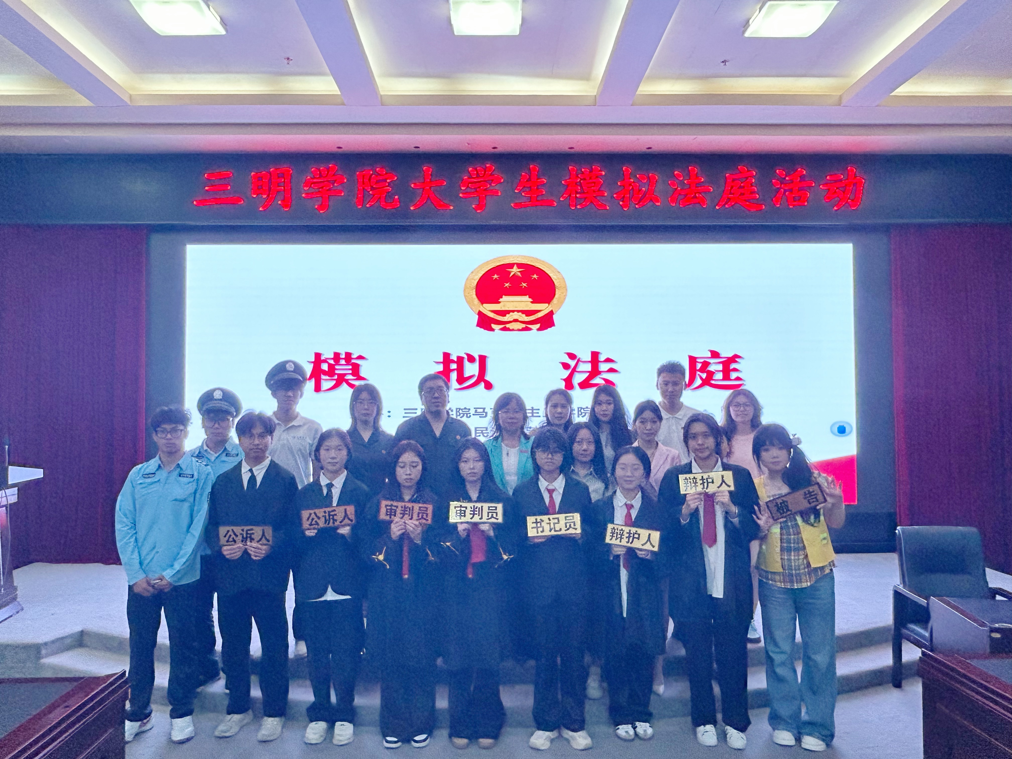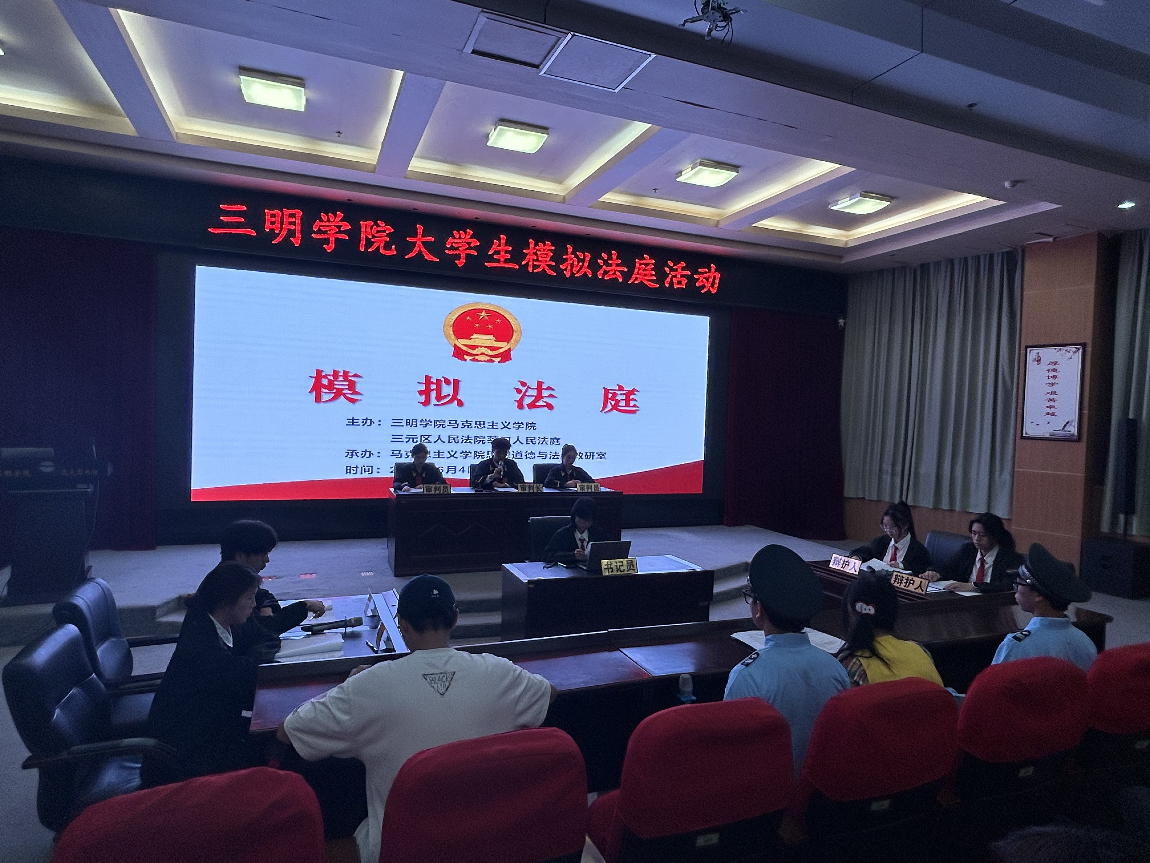 为进一步强化《思想道德与法治》课程教学效果,深入一站式学生社区加强学生法治教育,6月4日,由yl6809永利官网马克思主义学院、三元区人民法院莘口人民法庭主办,马克思主义学院思想道德与法治教研室承办的模拟法庭活动在yl6809永利官网图书馆学术报告厅顺利展开。莘口法庭庭长、一级法官张朝炼、莘口人民法庭四级法官助理卞晓激、马克思主义学院副院长徐桂兰教授、思想道德与法治教研室全体教师以及200多名学生参加活动。