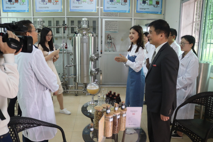 开播不久,直播团队就走进资源与化工学院,学院李奇勇院长热情接待了直播团队。李院长首先向主播和广大网友们从学院专业学科建设、人才培养、第二课堂等方面介绍了学院的基本情况,并引导大家品尝了学院黄河宁教授自主研发的草珊瑚饮料、李增富老师带领“明院精酿”创新班学子自主酿制的精酿啤酒,参加直播的工作人员被清凉可口、降温解暑的草珊瑚饮料和清香可口、泡沫丰富、风味独特的精酿啤酒所吸引,号召广大高考学子积极报考资源与化工学院各个专业,参与学生第二课堂活动,有机会品尝可口饮料和自酿美酒。
