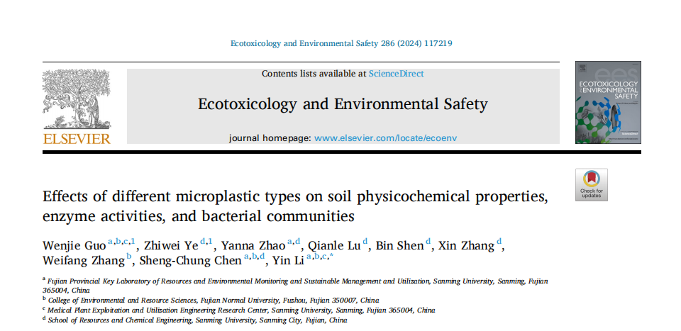 近日,我院生态环境修复团队以“Effects of different microplastic types on soil physicochemical properties, enzyme activities, and bacterial communities”为题,在国际知名期刊《Ecotoxicology and Environmental Safety》上发表了微塑料对土壤生态系统功能影响的研究成果。郭文杰(我校与福建师范大学联培研究生)、叶志伟(2021级环境工程专业本科生)为论文共同第一作者,李银副教授为论文通讯作者,yl6809永利官网为通讯单位。