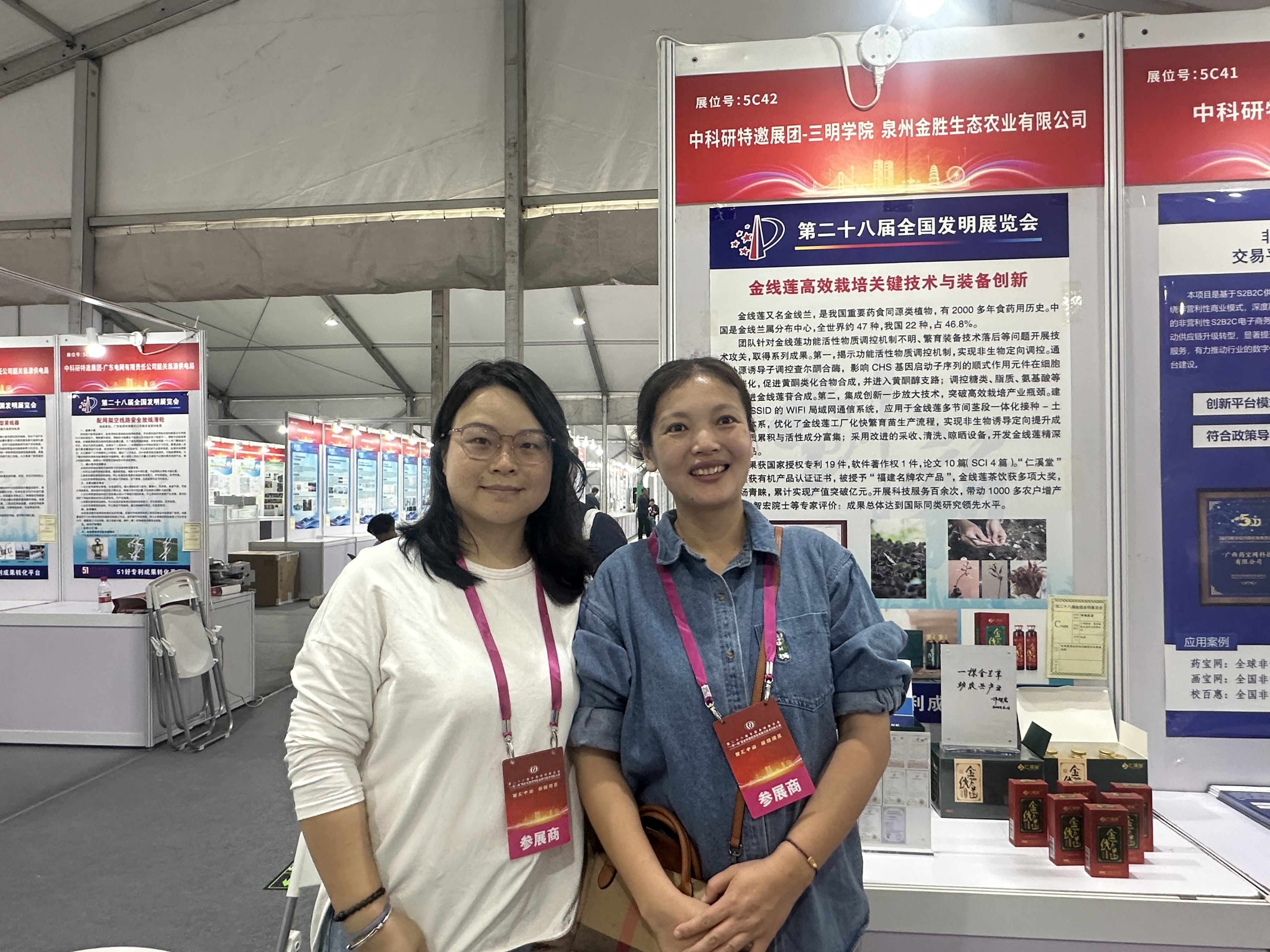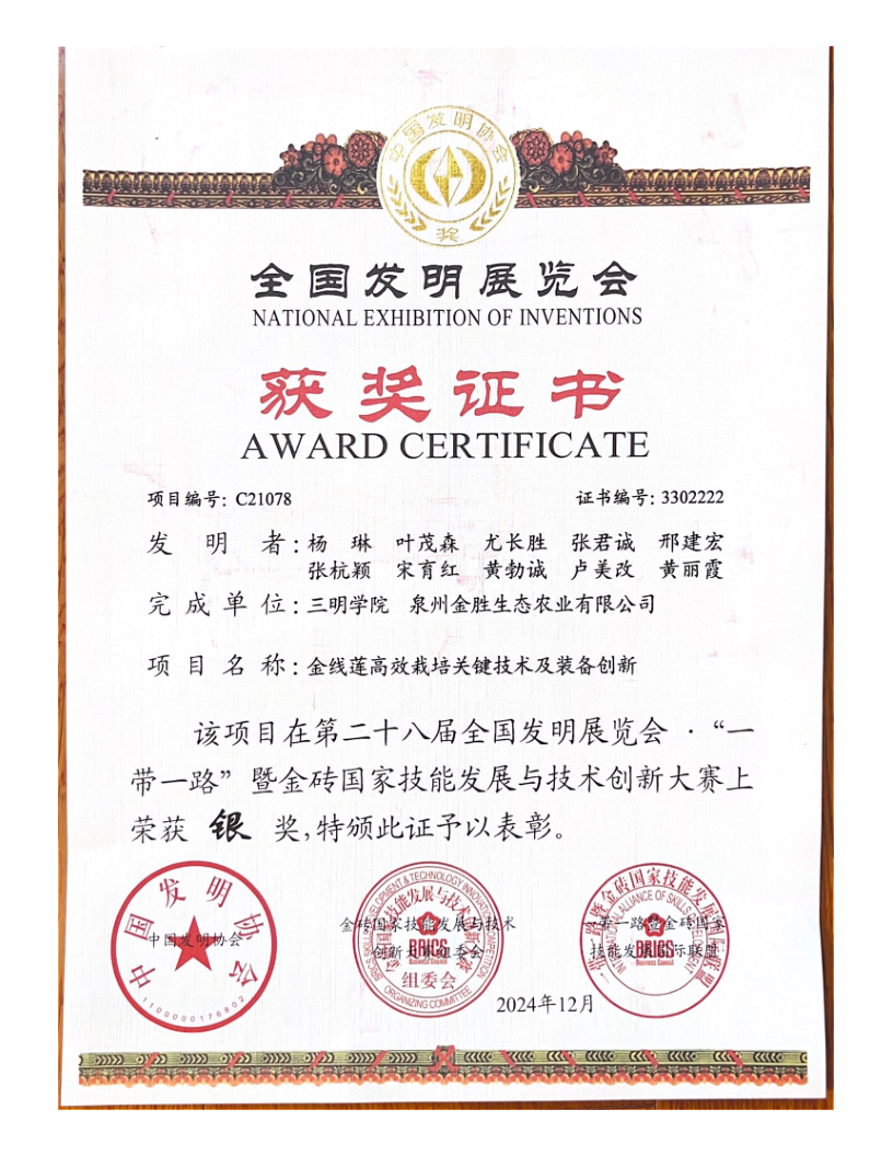 近日,由中国发明协会主办,科学技术部、中国科学技术协会、中华全国总工会、中国民主同盟中央委员会、科技日报社等单位协办的“第二十八届全国发明展览会”在广东省中山市举行。yl6809永利官网药用植物开发利用福建省高校工程研究中心联合泉州金胜生态农业有限公司的“金线莲高效栽培关键技术与装备创新”项目成为展会的关注焦点之一,经过专家评审委员会的评审,获第二十八届全国发明展览会·“一带一路”暨金砖国家技能发展与技术创新大赛银奖。杨琳和张杭颖老师代表团队参加了现场展示。
