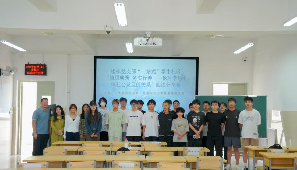 5月14日,资源与化工学院荷花苑一号楼栋党支部联合机关第一组团相关党支部举办以“慎思明辨,务实行善——伦理学与个体社会发展的关系”为主题的“一站式”社区读书分享会。楼栋党支部书记与图书馆党支部及学生代表共同参加。