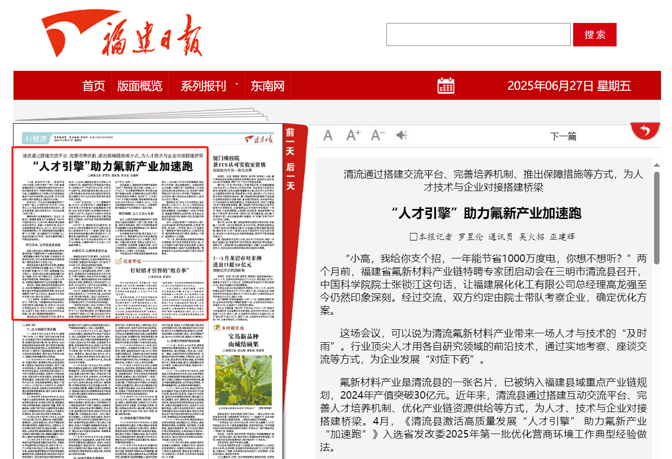 氟新材料产业是清流县的一张名片,已被纳入福建县域重点产业链规划,2024年产值突破30亿元。近年来,清流县通过搭建互动交流平台、完善人才培养机制、优化产业链资源供给等方式,为人才、技术与企业对接搭建桥梁。4月,《清流县激活高质量发展“人才引擎” 助力氟新产业“加速跑”》入选省发改委2025年第一批优化营商环境工作典型经验做法。