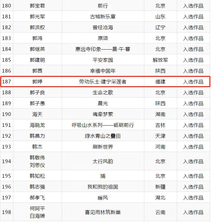 据悉,我省中国画共计入选作品15幅,艺术与设计学院郭婷老师的作品,也是三明地区美术界中国画唯一入选作品,有力显现出我校青年教师的专业技能。同时,郭婷老师的该幅作品,深入建宁修竹荷苑实地收集素材与创作,作品富有浓郁的三明地方特色,以中国重彩工笔画的细描与有力刻画,展现出了劳动者的生动形象,唱响新时代劳动赞歌,反映出我校教师植根本土、服务本土的良好态势。