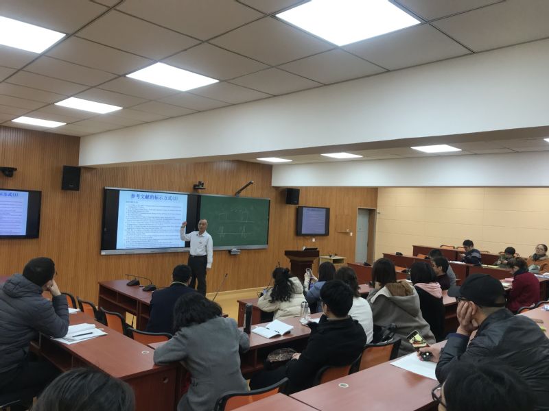林教授结合自身的国际学术期刊论文创作经历和博士论文指导经历,从国际学术期刊论文发表的现状 (含期刊领域与投稿内容形式)、写作技巧、主题订定、问题界定、发展结构流程、内容表现、格式、参考文献写法等封面展开。在讲到期刊的投稿形式时,林教授特意提醒大家,在写作的过程中一定要注意细节,注意行距、标点、个人信息等。2个小时的报告,干货满满,在场的青年教师认真聆听,专注做笔记。林铭泉教授的报告深入浅出、侃侃而谈,赢得了老师们的高度评价。