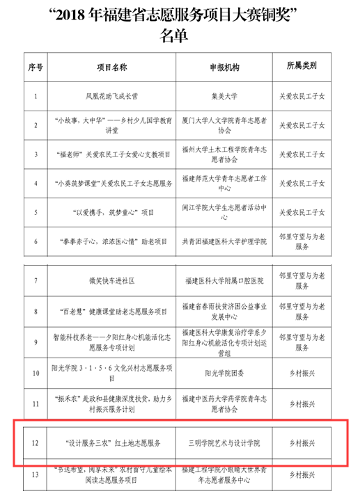 经过激烈角逐,由校团委选送,艺术与设计学院“设计服务三农”红土地志愿服务团队,脱颖而出,荣获大赛铜奖。项目由院长邱国鹏教授主持,伊林春、张静、林枭老师共同指导,学生凌浩轩、陈双颖、陈豪等组成。“设计服务三农红土地志愿服务”项目以聚焦“三农”问题,以“设计”+“农村、农民、农业”为切入点,打造全新的PSC乡村立体志愿服务模式(产品+服务+渠道),进而传承红色基因、服务乡村振兴、助力脱贫攻坚。