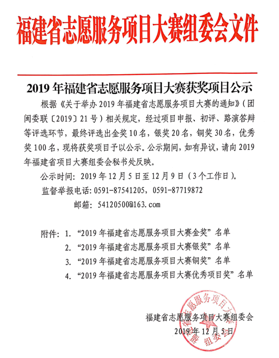 12月2日,2019年福建省志愿服务项目大赛在福州圆满结束。本次大赛共有414个项目参与,项目主题涵盖了阳光助残类、扶贫开发类、乡村振兴类、文化宣传类等。