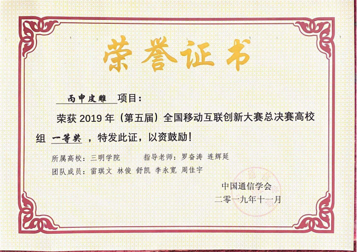 2019年 11月 15 日由中国通信学会、全国移动互联网产业孵化中心主办,中科创大创业教育投资管理有限公司协办的2019第五届全国移动互联创新大赛总决赛在北京开赛。我院参赛团队“丙申皮雕”荣获 高校组一等奖的好成绩。