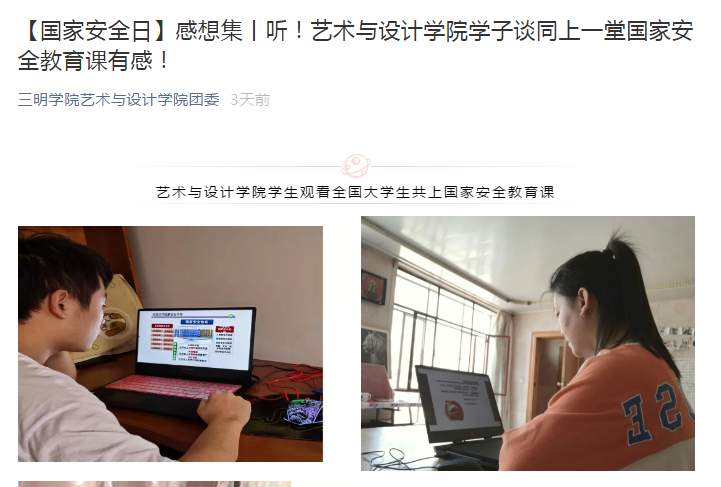 “作为一名大学生我们面对疫情应该树立正确的国家安全观,认真做好日常自我与家庭防护,充分利用假期丰富自我,做好心理调控,提升信息的辨识能力。”4月15日晚, 艺术与设计学院官微推送2017级美术学李炫炫在观看全国大学生共上同上一堂国家安全教育课后有感而发,点击量阅读达到806次。各个班级踊跃参与学院开展的“课后有感”活动,课程结束后不久,共收到近60人的感想。刚入学的2019产品设计1班余静茹说,上完课我的感受是在安全的问题上,来不得半点麻痹和侥幸,我们必须要防范在先、警惕在前,必须要警于思,合于规、慎于行必须要筑起思想、行为和生命的安全长城。学生代表的发言引起共鸣,激发了大家崇高的爱国热情和强大的民族自信。