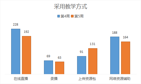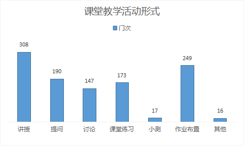 从收集的《网络在线教学运行情况教师反馈表》情况来看,我院在线教学的活动形式比较丰富多样,主要采取的课堂教学活动形式包括:讲授(308门次)、作业布置(249门次)、提问(190门次)和课堂练习(173门次)。从采用的教学方式来看,本周采用在线直播的为192门次,录播63门次,上传资源包131门次,网络资源辅助164门次。