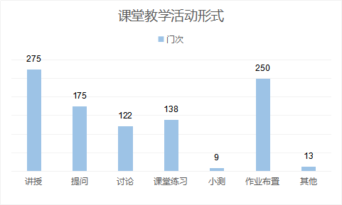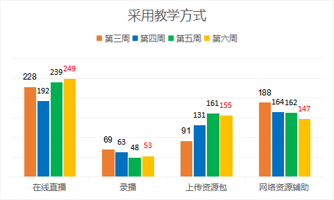 开学第6周,根据“应开尽开”原则,我院各专业及公共选修课本周应开必开课程314门次,其中通识教育选修课8门。从收集的《网络在线教学运行情况教师反馈表》情况来看,我院在线教学的活动形式比较丰富多样,主要采取的课堂教学活动形式包括:讲授(275门次)、提问(175门次)和课堂练习(138门次)、作业布置(250门次)。从采用的教学方式来看,本周采用在线直播的为249门次,录播53门次,上传资源包155门次,网络资源辅助147门次。从课后辅导形式的反馈情况来看,本周作业批阅为205门次,在线答疑263门次,讨论69门次。