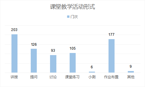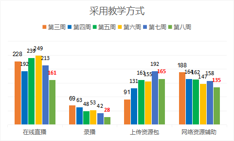 从收集的《网络在线教学运行情况教师反馈表》情况来看,我院在线教学的活动形式比较丰富多样,主要采取的课堂教学活动形式包括:讲授(203门次)、提问(126门次)和课堂练习(105门次)、作业布置(177门次)、讨论(93门次)。从采用的教学方式来看,本周采用在线直播的为161门次,录播28门次,上传资源包165门次,网络资源辅助135门次。从课后辅导形式的反馈情况来看,本周作业批阅为138门次,在线答疑207门次,讨论33门次。