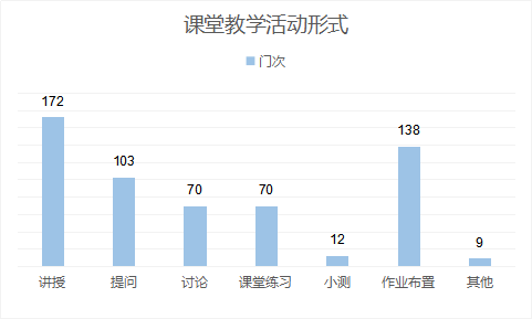 从收集的《网络在线教学运行情况教师反馈表》情况来看,我院在线教学的活动形式比较丰富多样,主要采取的课堂教学活动形式包括:讲授(172门次)、提问(103门次)、讨论(70门次)和课堂练习(70门次)、作业布置(138门次)。从采用的教学方式来看,本周采用在线直播的为139门次,录播23门次,上传资源包120门次,网络资源辅助93门次。从课后辅导形式的反馈情况来看,作业批阅112门次、在线答疑163门次、讨论49门次。